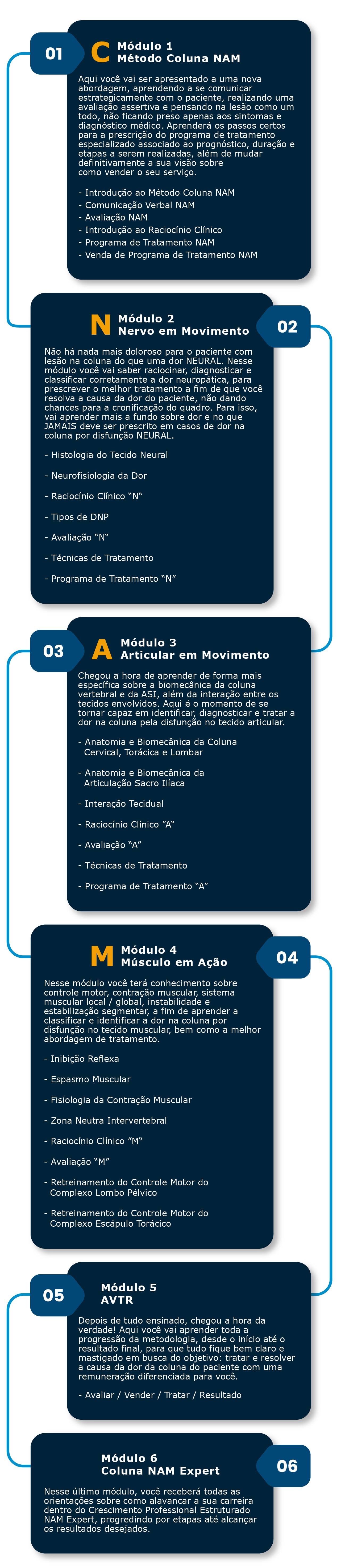 O método foi batizado de Coluna NAM, um jeito único, simples e objetivo de explicar como tratar a dor da coluna do paciente sendo bem remunerado e transformando-se em um Fisioterapeuta Referência.